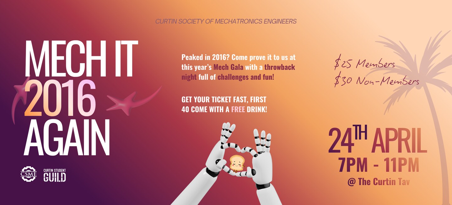 Mech Gala is the social event of the year, and for 2026 CSME is hosting a throwback! π Weβre planning to Mech it 2016 again, with fun minigames running all night to keep the energy high and the nostalgia flowing.π₯